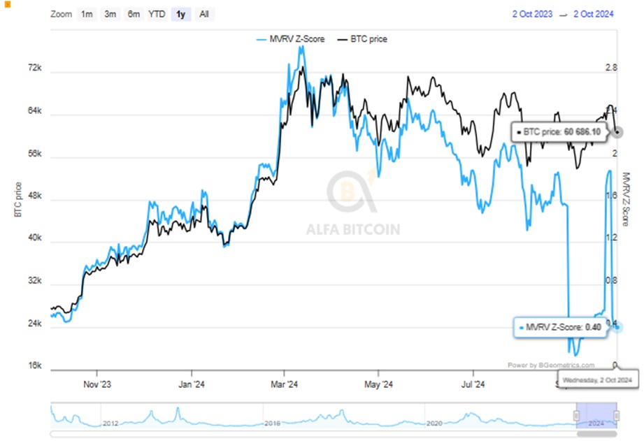 En otras palabras, este gráfico de Bitcoin usa la blockchain para ver si el precio de Bitcoin está muy por encima o por debajo de su valor normal. Se basa en tres mediciones: valor de mercado, valor realizado y un Z-Score. Sirve para identificar momentos extremos en el mercado, marcados por la línea roja, indicando picos y valles en los ciclos del mercado. Comprar durante los valles ha dado históricamente buenos rendimientos.